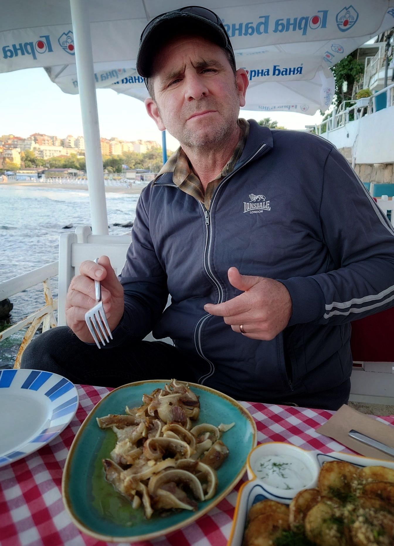 I’d mentioned Sozopol in my last post and I’ll mention it again because we wanted to treat ourselves to dinner at one of the restaurants perched on the cliffs above the sea.  I decided to go a bit native and try the traditional Bulgarian pigs’ ears.  There’s a photo included and while I wouldn’t order them again, they were tasty enough… but a bit gristly and not very meaty.